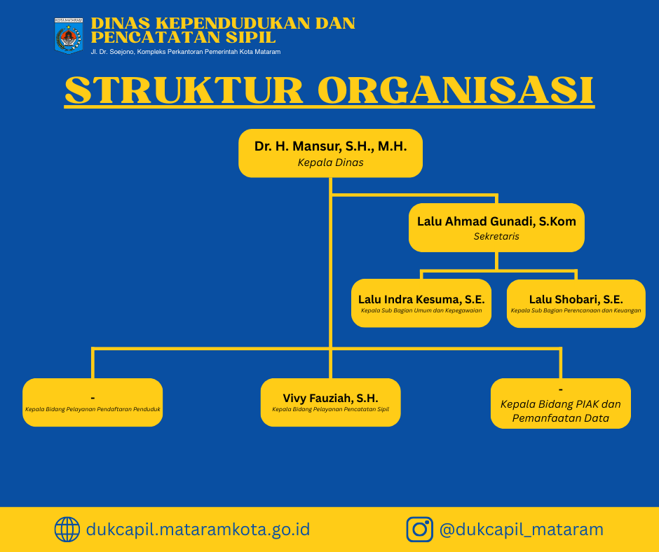 Dinas Kependudukan dan Pencatatan Sipil (Disdukcapil) Kota Mataram adalah perangkat daerah yang bertugas menyelenggarakan urusan pemerintahan di bidang administrasi kependudukan. Dipimpin oleh Kepala Dinas yang bertanggung jawab kepada Walikota melalui Sekretaris Daerah, Disdukcapil berperan penting dalam memberikan layanan publik terkait pendaftaran penduduk, pencatatan sipil, serta pengelolaan data kependudukan. Sebagai pelaksana pelayanan administrasi kependudukan, Disdukcapil Kota Mataram menjalankan fungsi perumusan kebijakan teknis, penyelenggaraan pelayanan umum, pembinaan, serta pengendalian pelaksanaan tugas di bidang kependudukan dan pencatatan sipil. Struktur organisasi Disdukcapil terdiri dari sekretariat, bidang pelayanan pendaftaran penduduk, bidang pelayanan pencatatan sipil, bidang pengelolaan informasi administrasi kependudukan dan pemanfaatan data, unit pelaksana teknis, serta kelompok jabatan fungsional. Dengan struktur ini, Disdukcapil Kota Mataram berkomitmen memberikan pelayanan yang cepat, tepat, dan akurat dalam mendukung tertib administrasi kependudukan.